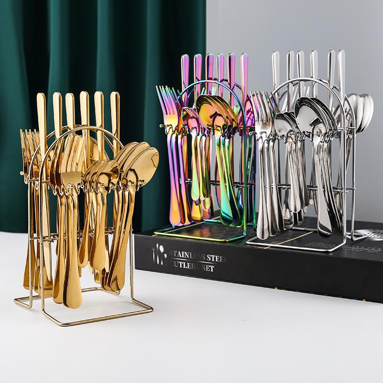 [挂架彩盒餐具] YMX-1014 镜面花挂架24件套不锈钢幻彩色餐具套装