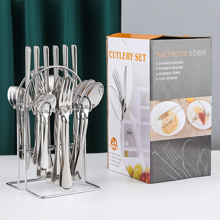 [挂架彩盒餐具] YMX-1014 镜面花挂架24件套不锈钢银色餐具套装