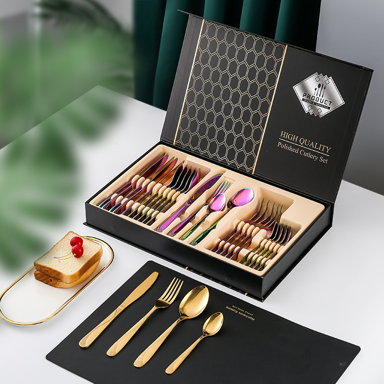 [礼盒装餐具] YMX-1013 镜面梨花纹24件套不锈钢幻彩色餐具礼盒套装