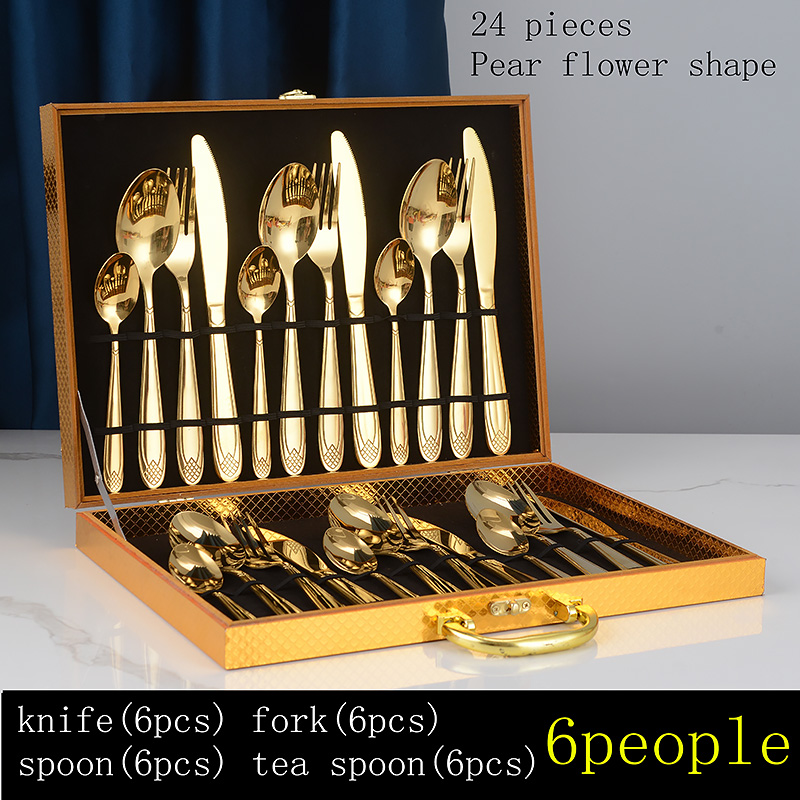 YMX-1013 镜面梨花纹24件套不锈钢金色餐具木盒套装镜面