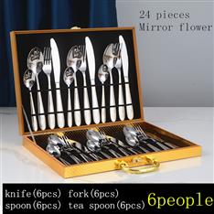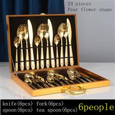 [木盒餐具] YMX-1013 镜面梨花纹24件套不锈钢金色餐具木盒套装镜面