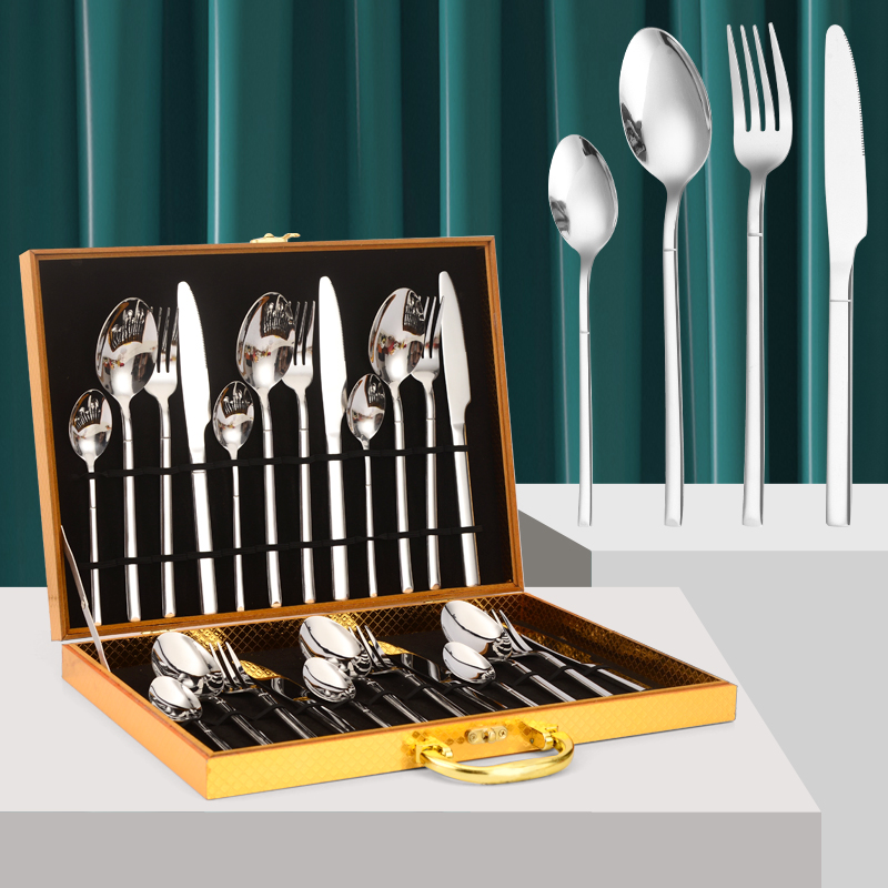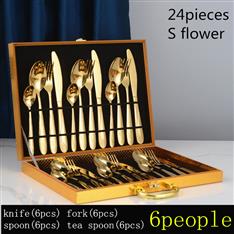 [木盒餐具] YMX-1015 镜面S型纹24件套不锈钢金色餐具木盒套装