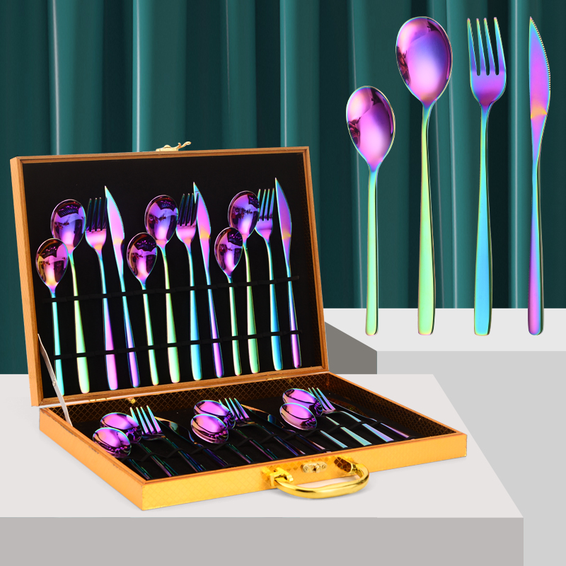 YMX-1012 韩式系列 24件套 木盒不锈钢幻彩色餐具套装