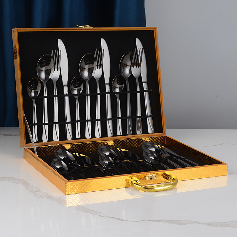 [木盒餐具] YMX-1015 镜面S型纹24件套不锈钢金色餐具木盒套装