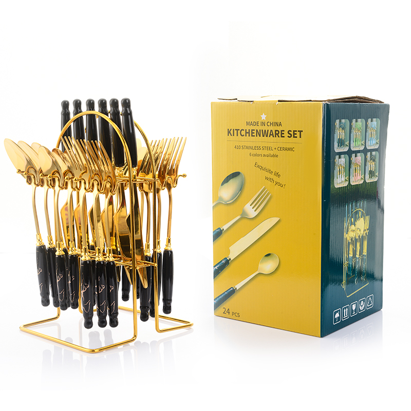 [挂架彩盒餐具] YMX-1014 镜面花挂架24件套不锈钢金色餐具套装