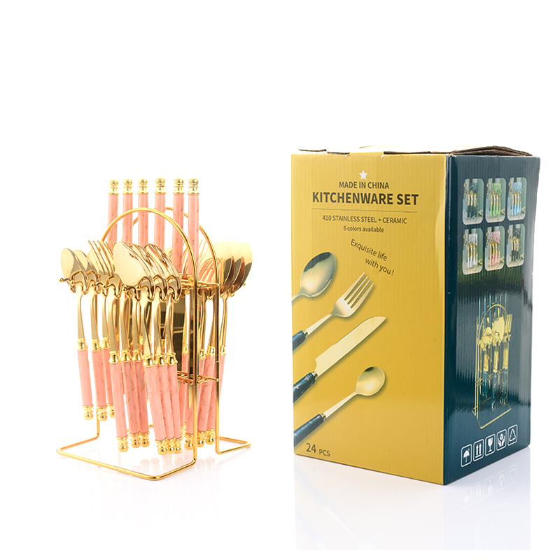 YMX-1018 塑料柄系列挂架24件套不锈钢粉金色餐具套装