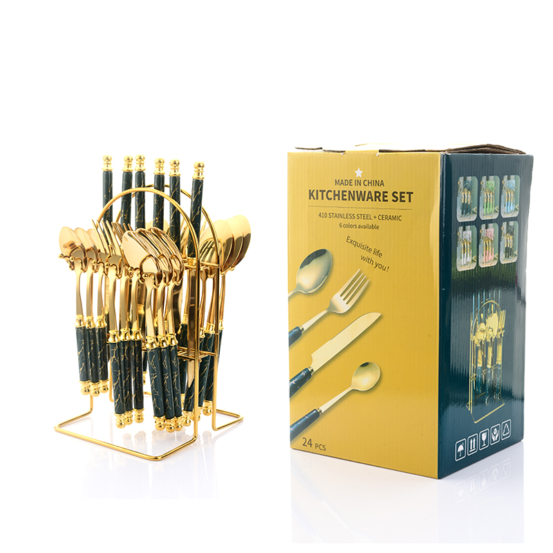 [挂架彩盒餐具] YMX-1014 镜面花挂架24件套不锈钢金色餐具套装
