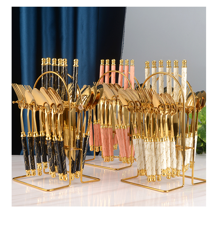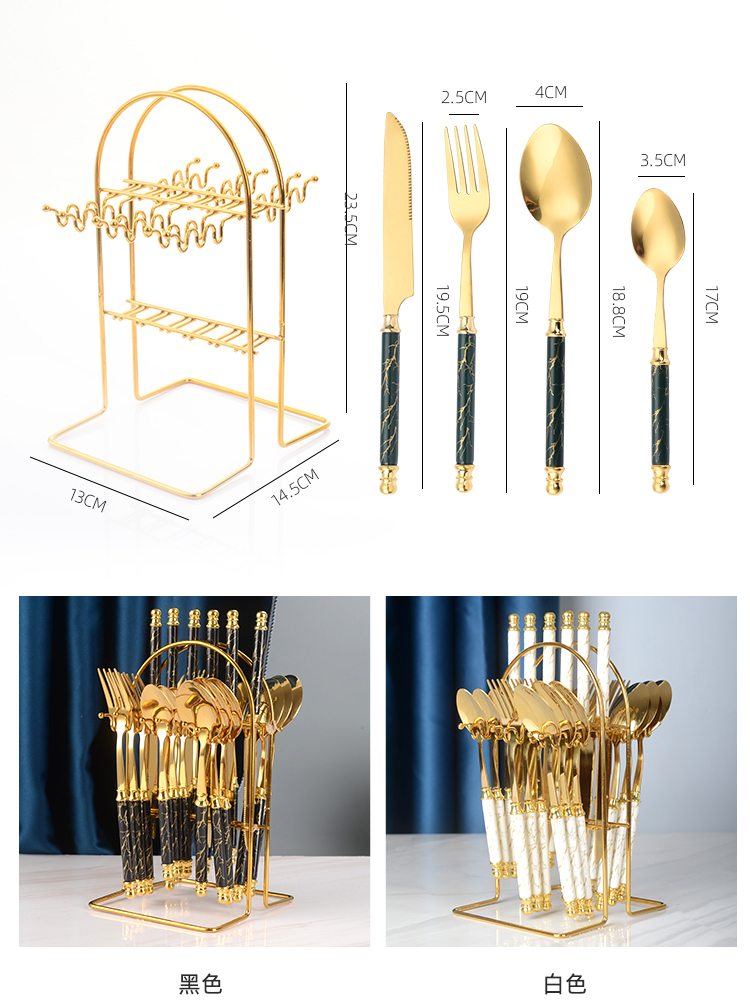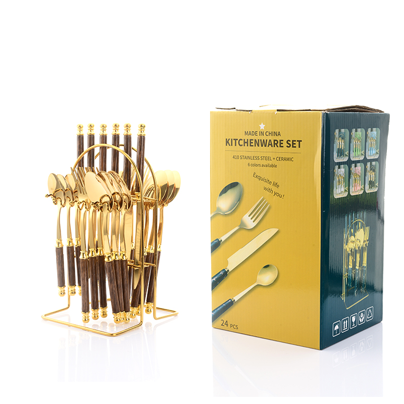YMX-1018 塑料柄系列挂架24件套不锈钢棕金色餐具套装