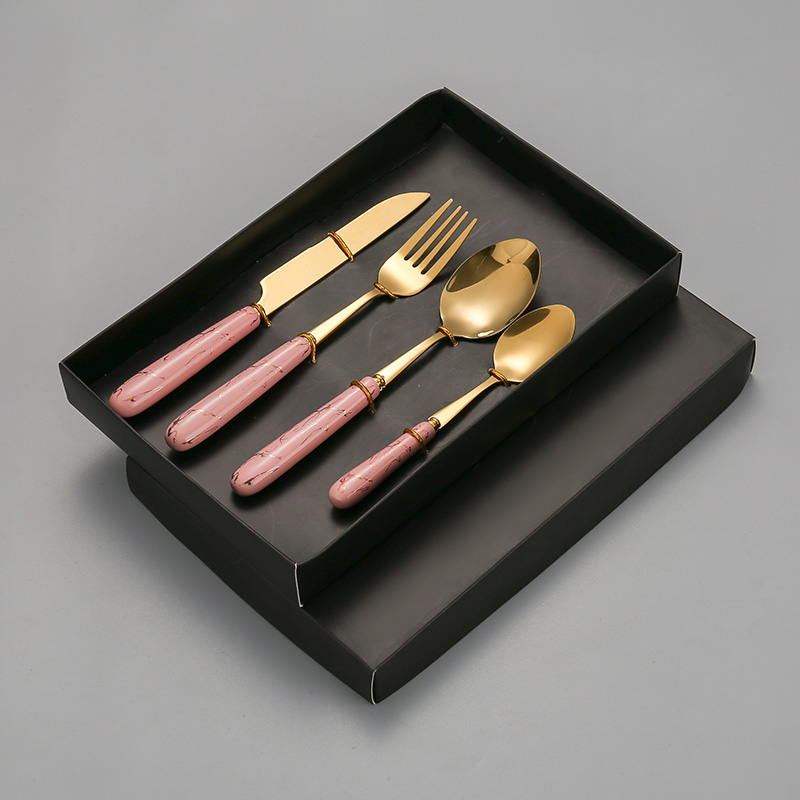 YMX-1023 陶瓷金丝纹系列挂架4件套不锈钢粉金色餐具套装