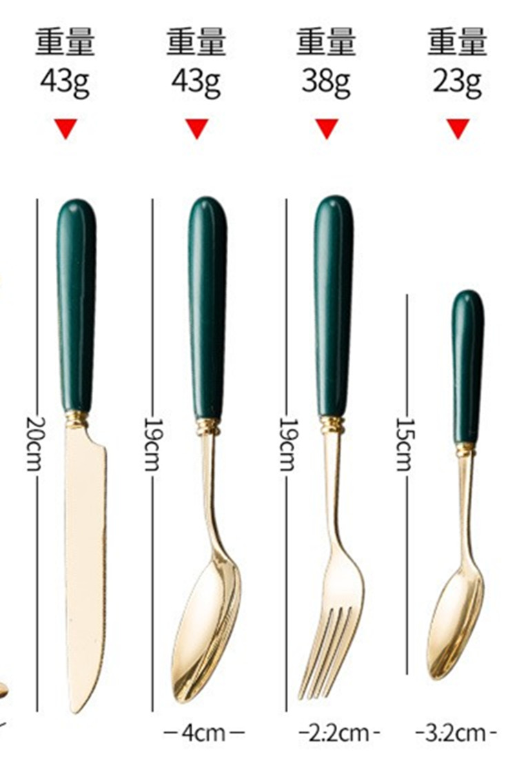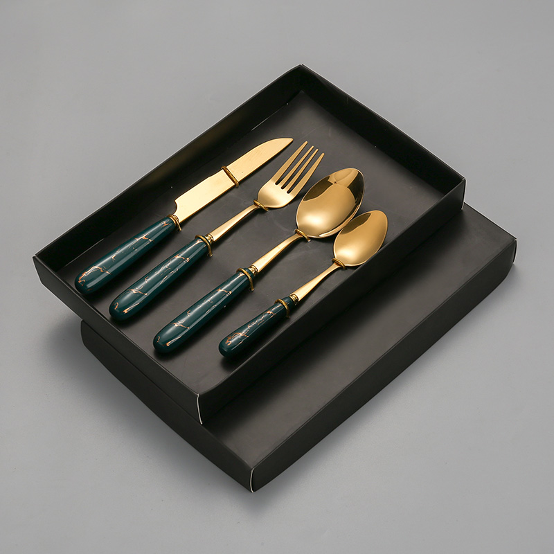 YMX-1023 陶瓷金丝纹系列挂架4件套不锈钢墨绿金色餐具套装