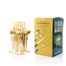 【挂架彩盒餐具】YMX-1014 镜面花挂架24件套不锈钢金色餐具套装