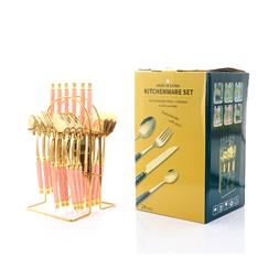 【挂架彩盒餐具】YMX-1018 塑料柄系列挂架24件套不锈钢粉金色餐具套装