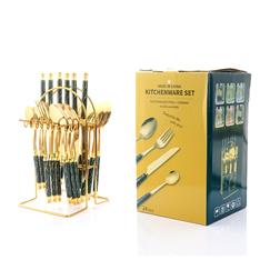 【挂架彩盒餐具】YMX-1018 塑料柄系列挂架24件套不锈钢绿金色餐具套装
