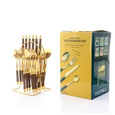 【挂架彩盒餐具】YMX-1018 塑料柄系列挂架24件套不锈钢棕金色餐具套装