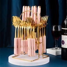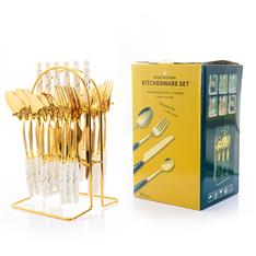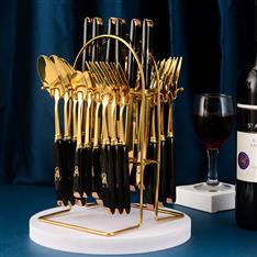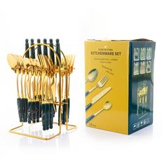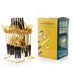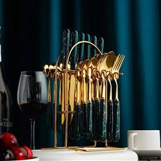 【挂架彩盒餐具】YMX-1023 陶瓷金丝纹系列挂架24件套不锈钢墨绿金色餐具套装