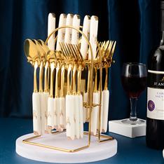 【挂架彩盒餐具】YMX-1019 陶瓷葫芦柄系列挂架24件套不锈钢白金色餐具套装