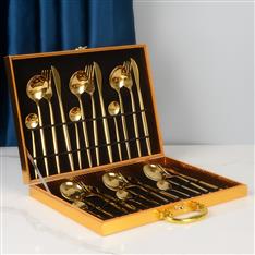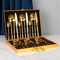 【木盒餐具】YMX-1016 葡萄牙系列24件套不锈钢金色餐具木盒套装