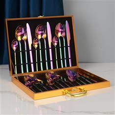 【木盒餐具】YMX-1016 葡萄牙系列24件套不锈钢幻彩色餐具木盒套装